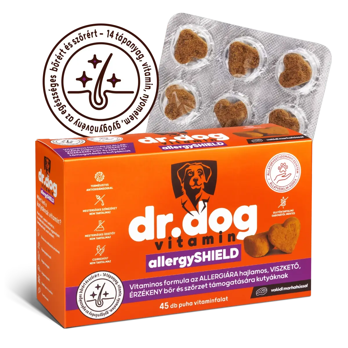 • Omega-3 halolaj, természetes növényi anyagok és olajok, vitaminok és nyomelemek tudományos igényességgel összeállított prémium minőségű szinergikus kombinációja, az egészséges bőr és szőrzet kíméletes támogatására.
