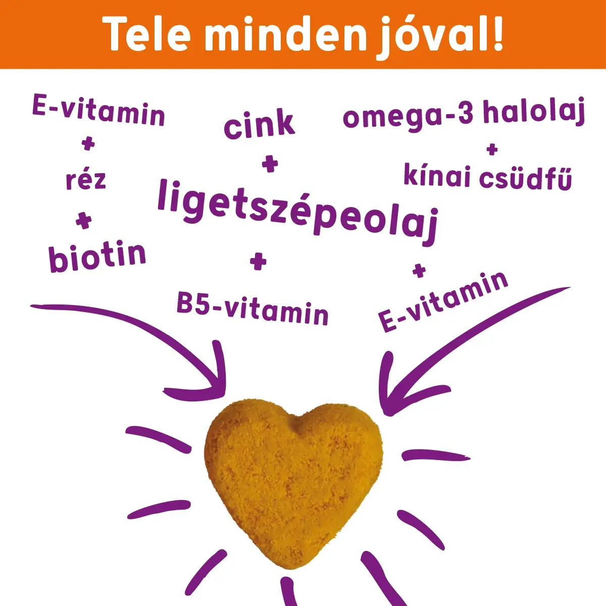Vitaminok: E-vitamin; C-vitamin; B2-vitamin; B3-vitamin (niacinamid); B5-vitamin (kalcium-D-pantotenát); Biotin.